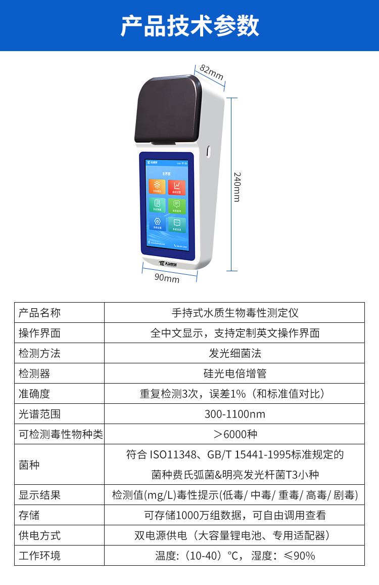 該儀器核心優勢在于高標準精準檢測體系。嚴格依據國標 GB/T15441 - 1995 和國際標準 ISO 11348 - 3 設計,采用發光細菌法,搭載高靈敏度硅光電倍增管,光譜范圍覆蓋 300 - 1100nm,可精準捕捉細菌發光強度變化。重復檢測誤差僅 1%,能檢測超過 6000 種毒性物質,搭配費氏弧菌等標準菌種,